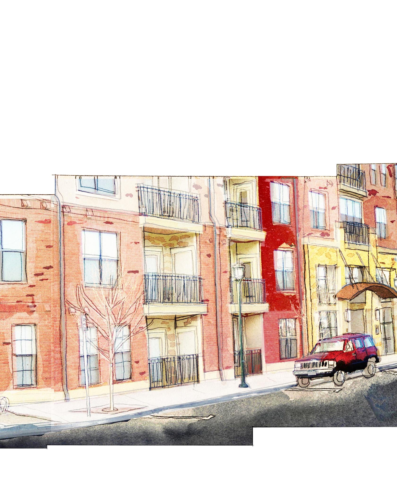 Industrial structures and a stadium rise behind rust-orange barriers. The painting stretches wide to capture the scale of urban infrastructure. A love letter to working cities.